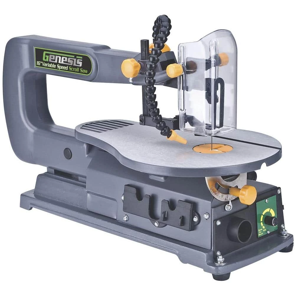 Perform laser-like cuts up to 2 in. deep with the 16 in. variable-speed scroll saw from Genesis. The ultra-fine blade on this tool produces smooth, exacting wood cuts that leave flush edges rarely needing sanding. This quiet 1.2-Amp machine has variable speeds (400-1600 SPM) to adjust for different materials and patterns while a dust blower keeps your work surface free of debris. Maneuver objects up to 16 in. wide across a table that can be tilted up to 45° for beveled cuts. Woodworkers involved in marquetry or those needing to make pierce cuts will be enamored with this device.