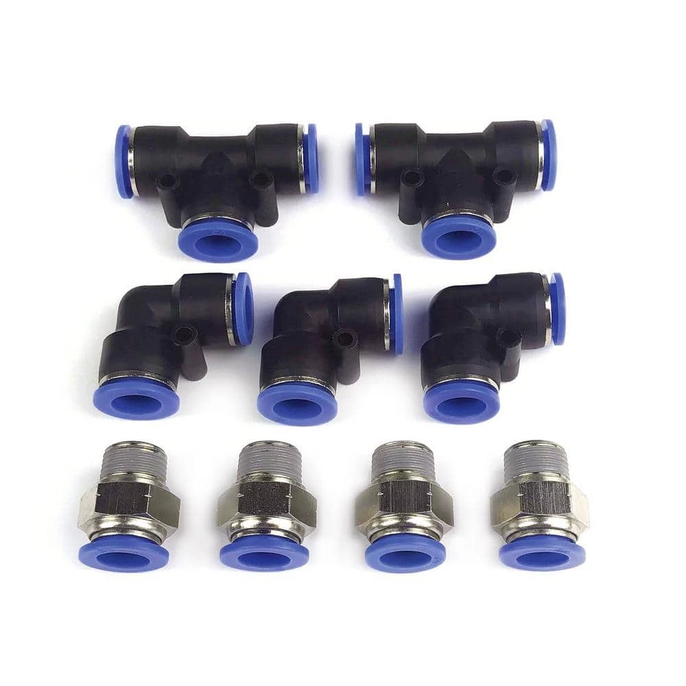 - Kit contains: (2-pieces) T connectors, (3-pieces) 90° elbow connectors, (4-pieces) 1/2 in. tubing to 3/8 in. male NPT connectors