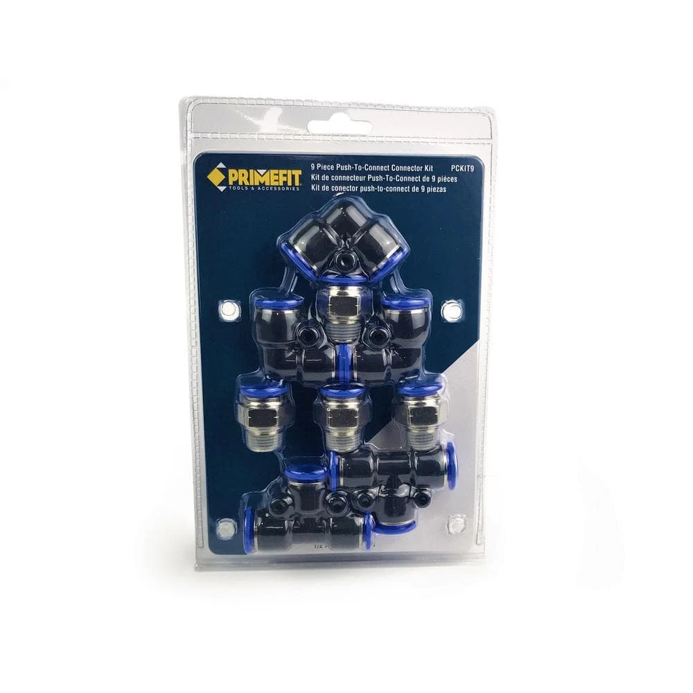 The Primefit PCKIT9 is a 9-Piece Air Push To Connect – Connector Kit. This kit is for use with all 1/2 in. OD (Outside Diameter)/3/8 in. ID (Inside Diameter) Air Tubing. Kit includes (2-pieces) T-Connectors, (3-pieces) 90° Elbow Connectors, (4-pieces) 1/2 in. Tubing to 3/8 in. Male NPT Connectors.