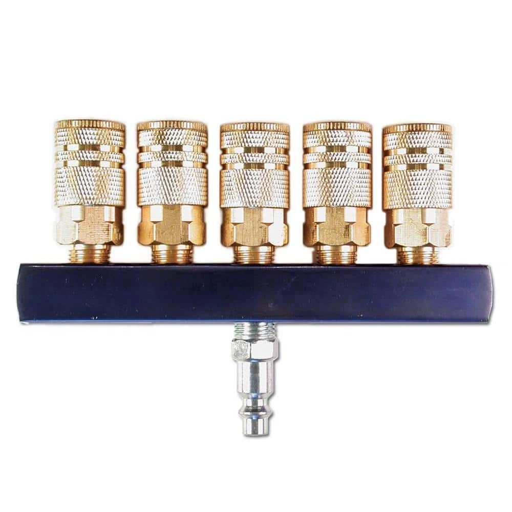 - 5-Way air manifold and splitter with (5) 1/4 in. brass 6-ball couplers