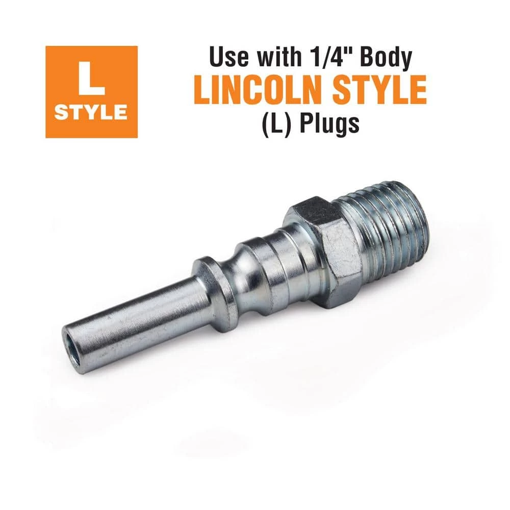 The Lincoln Steel Coupler Set features a professional grade, 1/4 in. quick connect coupler and 1/4 in. male quick connect plug that fits most common air tools and nailers. The Lincoln style interchanges compatible with Lincoln, “L” and Amflo “A” style plugs and couplers. This Zinc-plated steel coupler features high corrosion resistance, long life and smooth operation.