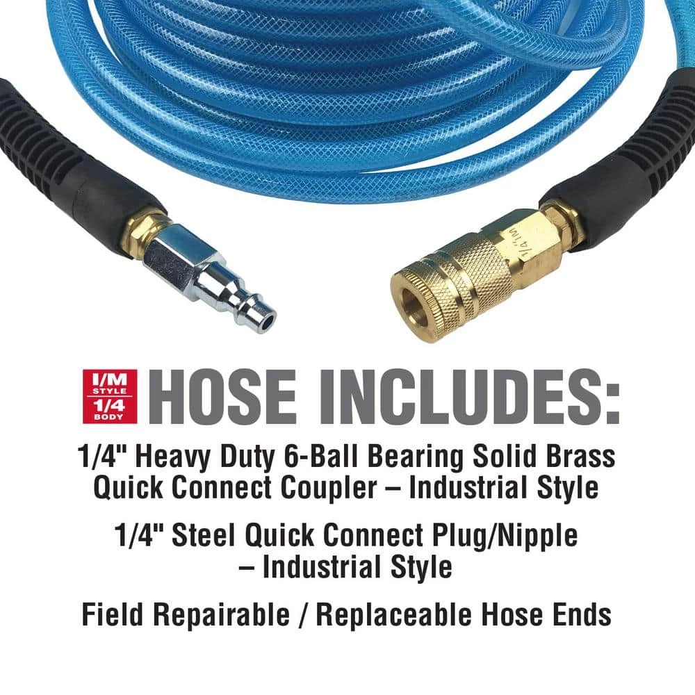 The Premium Polyurethane Air Hose uses the lightest hose material in the market, while also providing excellent flexibility in cold temperatures. The PU140502C-B is perfect whether you’re working at home or at a job site and features a maximum working pressure of 200 psi (pounds per square inch). This air hose has a 1/4 in. hose size with a 50 ft. L and comes with field repairable hose ends.