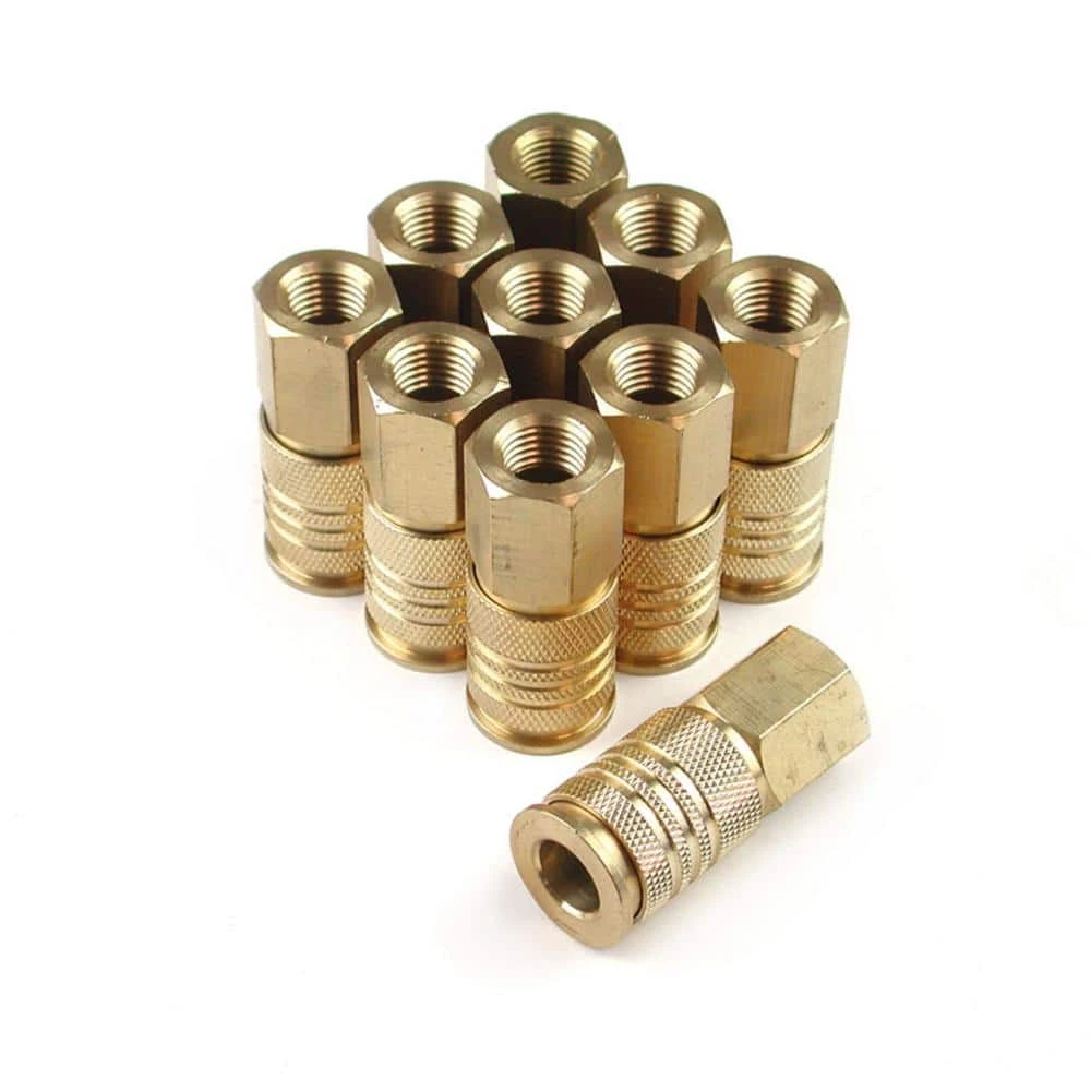 The 1/4 in. Brass 6-Ball Female Universal Coupler is a 10-Piece Contractor pack of heavy duty – professional-grade, male, 6-ball, brass, and air quick connect couplers. Universal style interchange will adapt to the 3 most popular interchanges – Industrial/M-Style, Automotive/trifoliate, and ARO styles. 6 Locking steel balls for increased life and holding power. Nitrile seals for performance in extreme temperatures, and solid brass construction for high corrosion resistance and longer life.