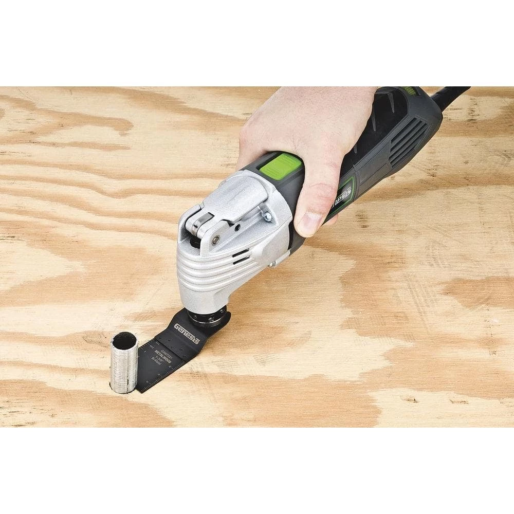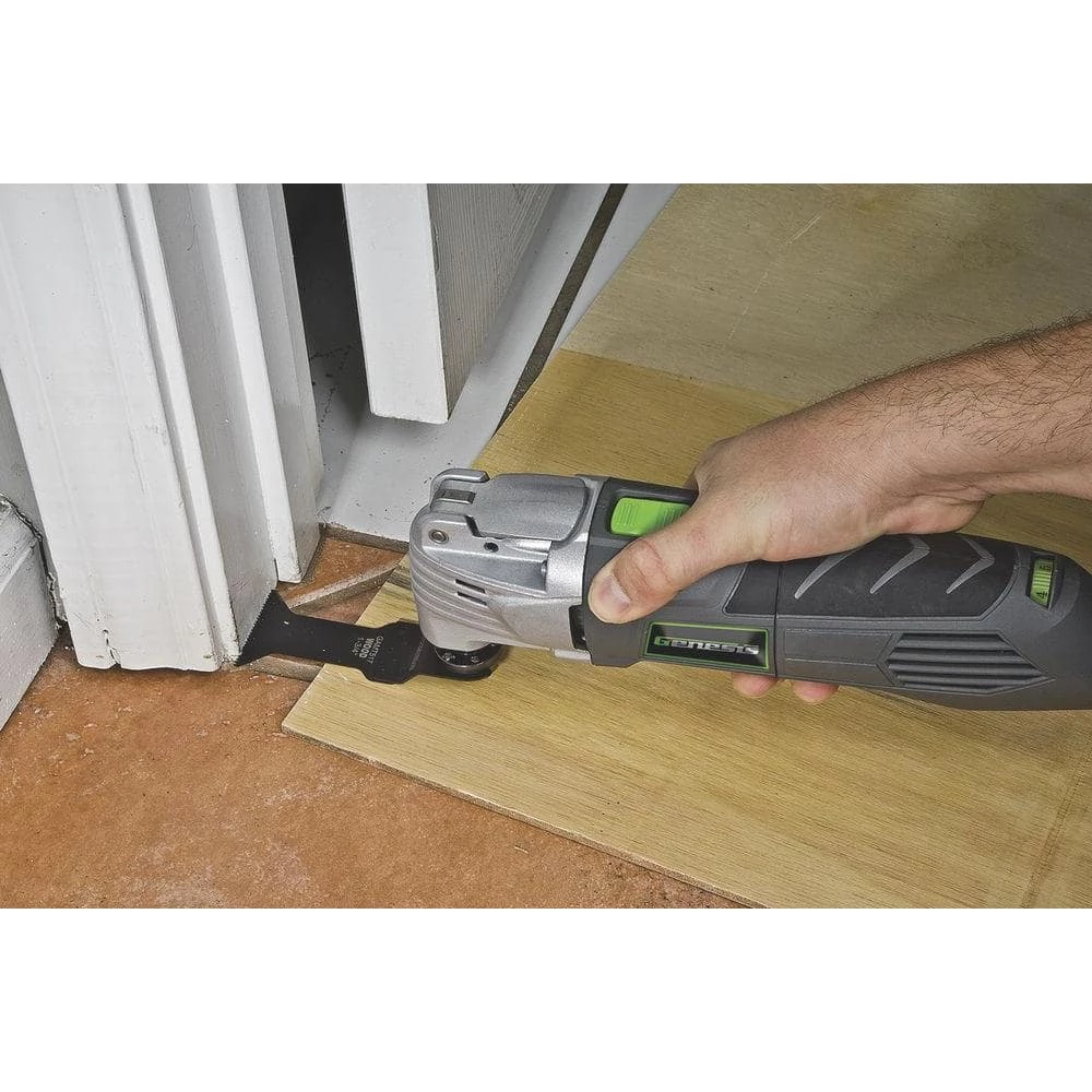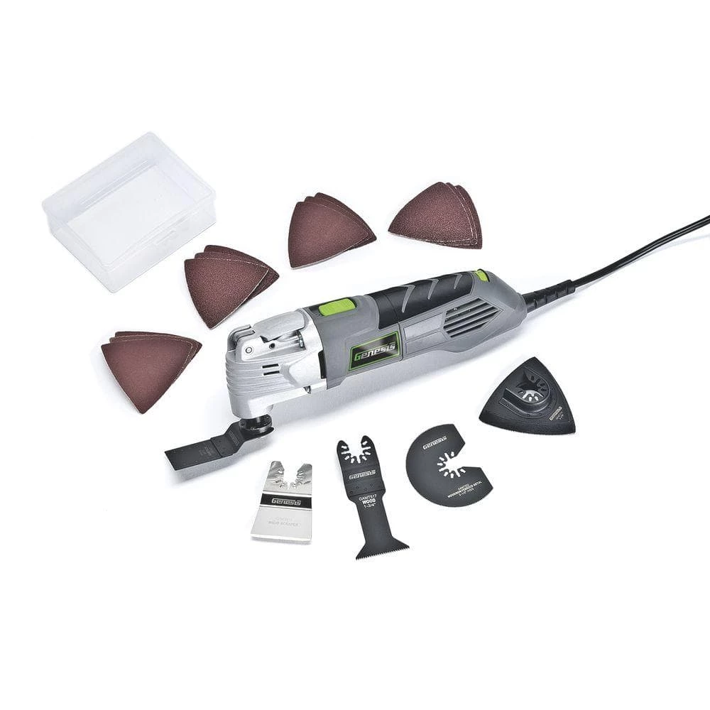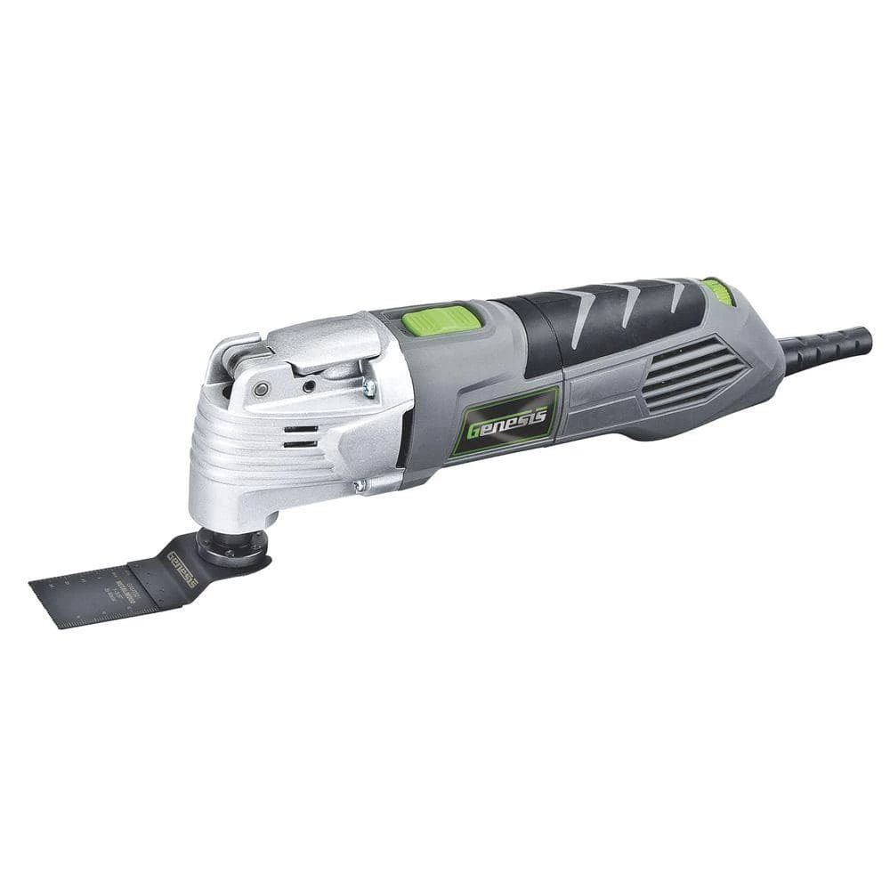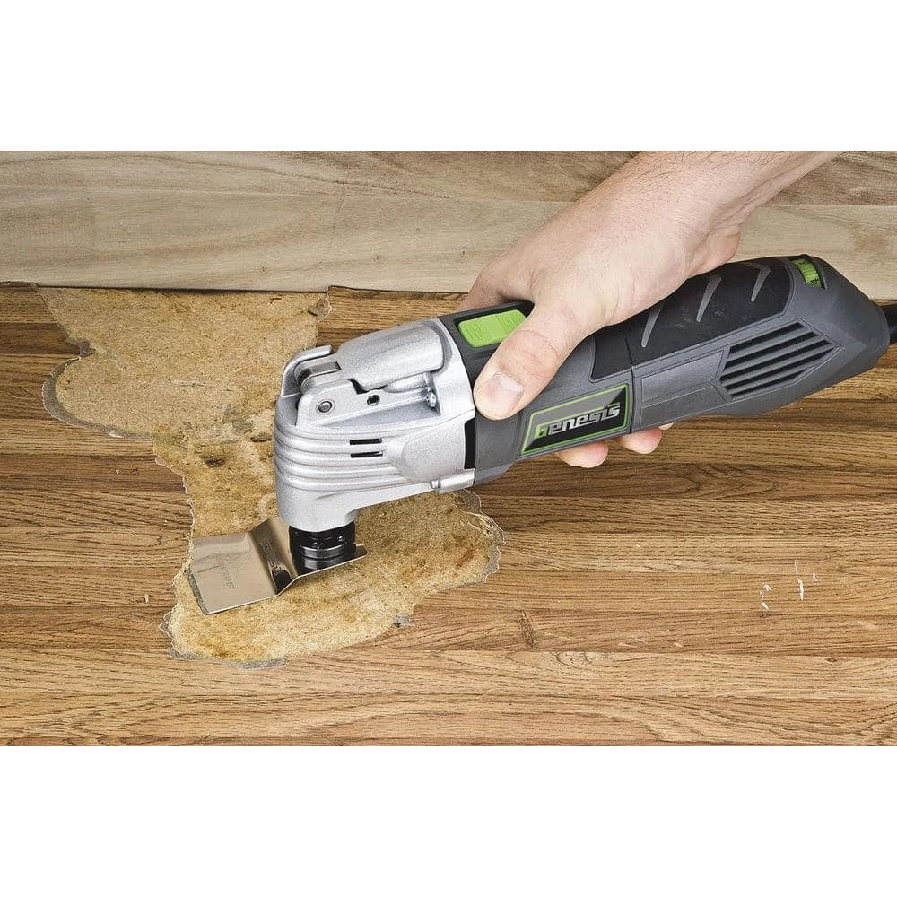 Genesis 2.5-Amp Variable Speed Multi-Purpose Oscillating Tool is useful in all areas of home repair, remodeling and restoration. Use as a detail sander, flush and plunge cut saw, drywall cut-out tool, power scraper, grout removal tool and more. No tools required for accessory quick change system. Storage box included for accessories.