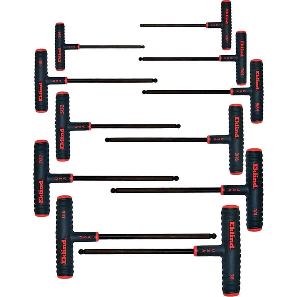 Eklind 11-piece 9 in. Series Power-T T-Handle Ball-Hex Key Set with Pouch. Includes Inch Sizes: 5/64 in., 3/32 in., 7/64 in., 1/8 in., 9/64 in., 5/32 in., 3/16 in., 7/32 in., 1/4 in., 5/16 in. Eklind power-T T-handle hex keys have a soft in., textured over mold for extra comfort in., slip resistance and safety.