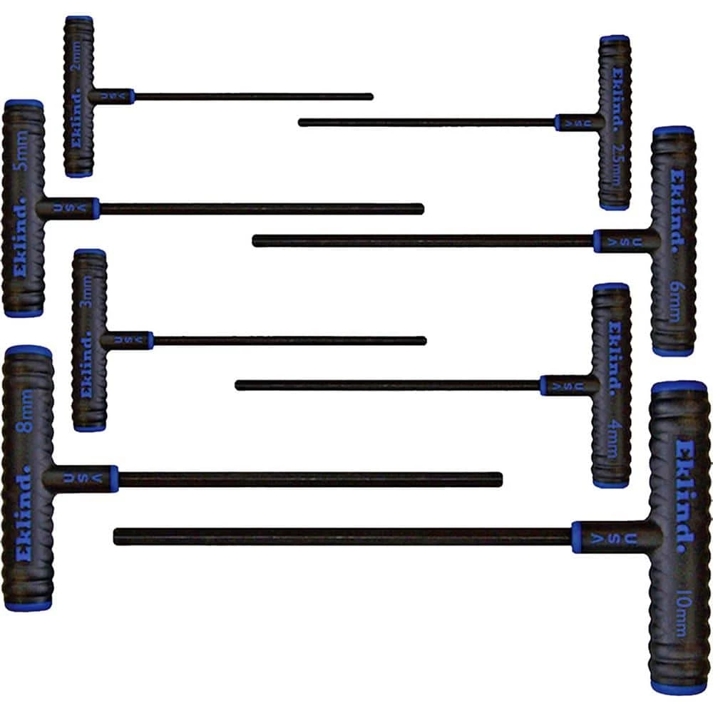 The Eklind 8-piece 9 in. Series Power-T T-Handle Hex Key Set with Pouch includes MM Sizes: 2 mm, 2.5 mm, 3 mm, 4 mm, 5 mm, 6 mm, 8 mm, and 10 mm.. Eklind power-T T-handle hex keys have a soft mm, textured over mold for extra comfort mm, slip resistance and safety.