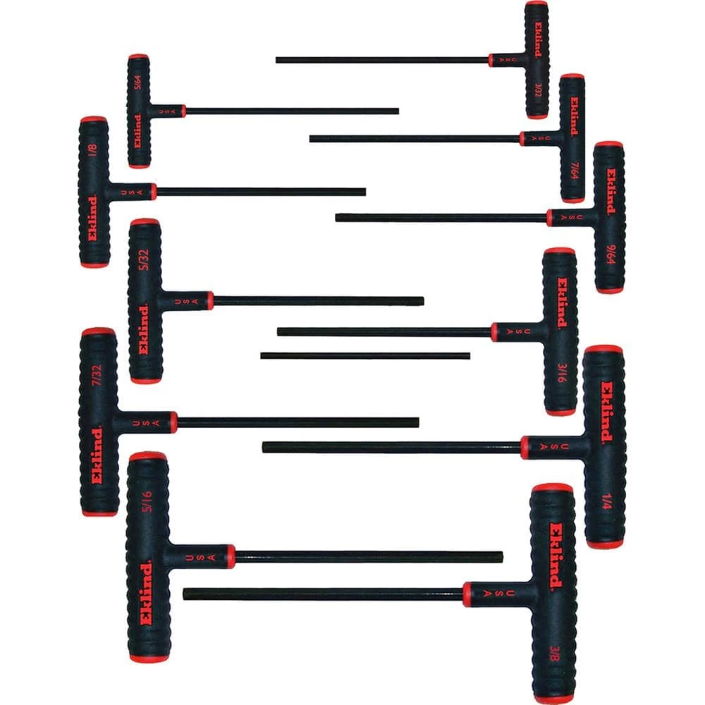Eklind 11-piece 9 in. Series Power-T T-Handle Hex Key Set with Pouch. Includes Inch Sizes: 5/64 in., 3/32 in., 7/64 in., 1/8 in., 9/64 in., 5/32 in., 3/16 in., 7/32 in., 1/4 in., 5/16 in., and 3/8 in. Eklind power-T T-handle hex keys have a soft in., textured over mold for extra comfort in., slip resistance and safety.