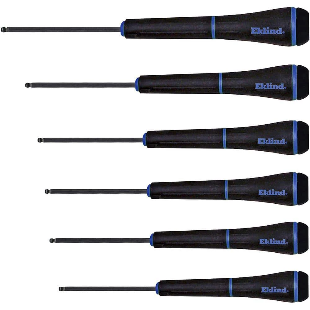The Eklind 6-piece Ball-Hex Series PSD Precision Screwdriver Set with Pouch includes MM Sizes: 1.3 mm, 1.5 mm, 2 mm, 2.5 mm, 3 mm, and 4 mm. Eklind PSD Precision Screwdrivers have larger handles and a soft over mold for greater comfort and ergonomics.