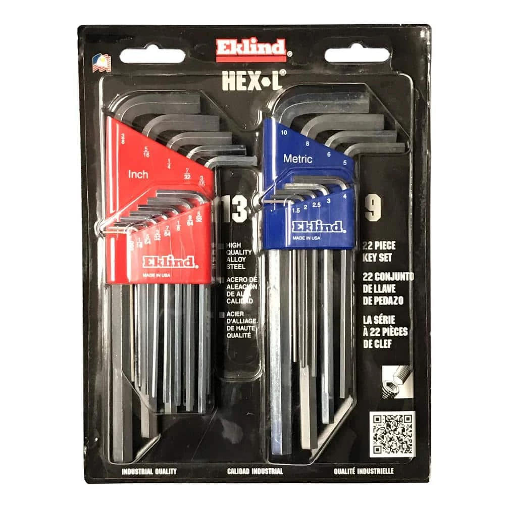 The Eklind 22-piece Combination Bright-Hex-L Key Set, includes the following 2 sets: #11609: 9-piece Long Series Bright-Hex-L Key Set with Holder. MM Sizes: 1.5 mm, 2 mm, 2.5 mm, 3 mm, 4 mm, 5 mm, 6 mm, 8 mm, and 10 mm and #11213: 13-piece Long Series Bright-Hex-L Key Set with Holder. Inch Sizes:0.050 in., 1/16 in., 5/64 in., 3/32 in., 7/64 in., 1/8 in., 9/64 in., 5/32 in., 3/16 in., 7/32 in., 1/4 in., 5/16 in., and 3/8 in.