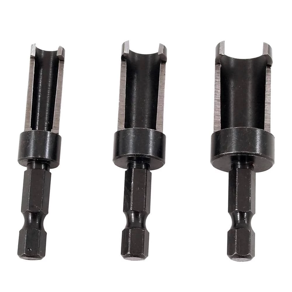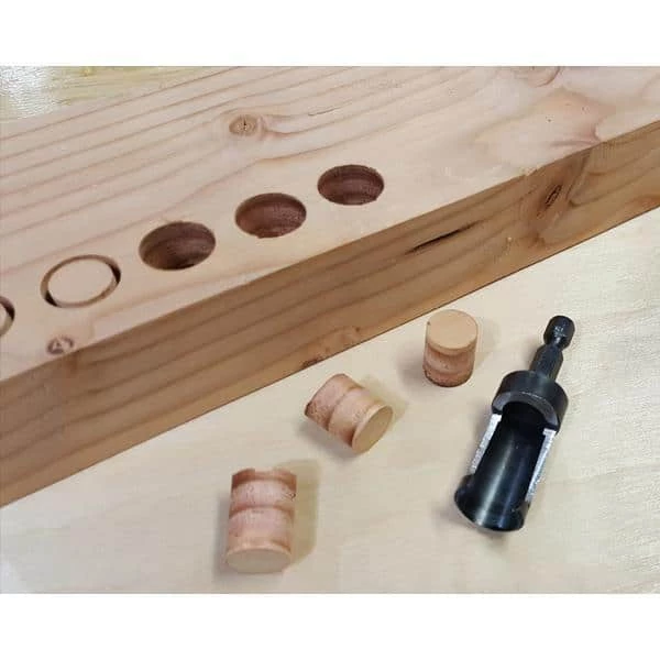 - Plug cutters in 3-sizes produce 1/4 in. 3/8 in., and 1/2 in. tapered plugs to cover screws or hide blemishes
