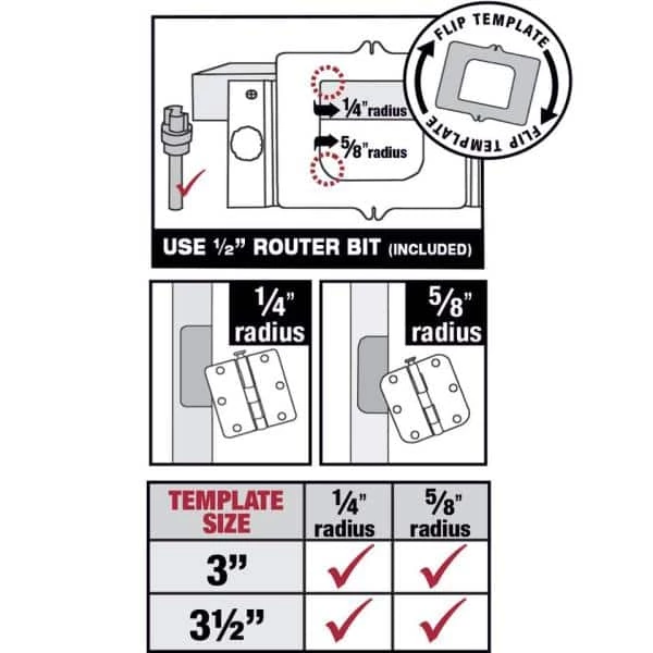 - Door hinge templates needed to rout hinge mortises, 3 in. and 3-1/2 in. sizes included