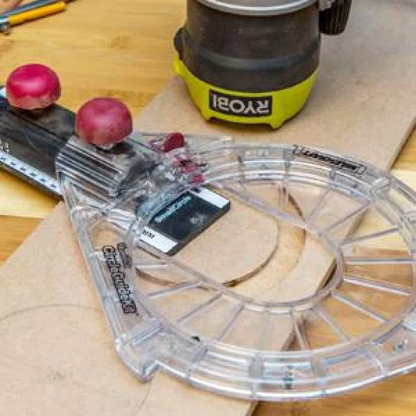 - Small router circle jig has built-in imperial and metric scales, with an easy readout window for setting the diameter of both your inside and outside cuts