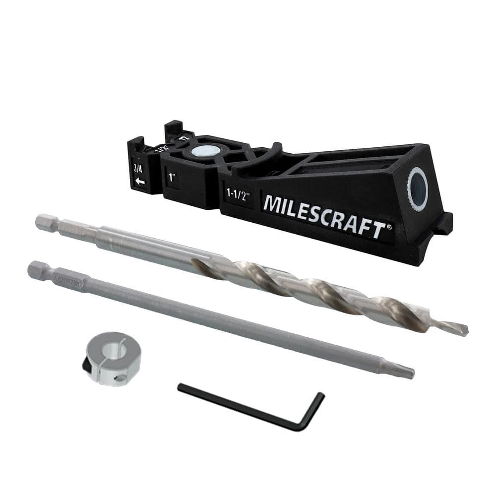 The ultimate pocket hole kit includes the Milescraft PocketJig100, single barrel jig, the Milescraft PocketJig200 double barrel jig, plus a 2 in. FaceClamp and accessories. Everything you need for your pocket hole projects. PocketJig200 pocket hole jig allows you to connect your workpieces in a quick and timely manner. Whether you want to build storage projects, cabinets, shelves or bookcases, this kit does it all. Allowing you to create corner joints, T-Joints, Framing Joints, Miter Joints and do repairs. With built-in settings for board thicknesses, there is no need to manually measure. Just set this pocket jig to your desired setting, set the depth of your bit and start drilling. PocketJig100 has a small, compact design that allows you to do applications where a small jig is required. Built-in board thickness locations for easy measurement and set-up of your workpieces, virtually eliminating the need for manual measurements.