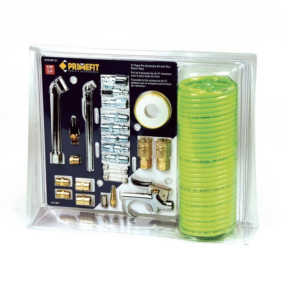 The Primefit 27-Piece Garage Air Compressor Accessory Kit is the perfect gift or home accessory kit. Inflate anything around your home or business with ease. The 25 ft. Polyurethane recoil is super flexible and easily extends. You’ll love this kit. I sure do.