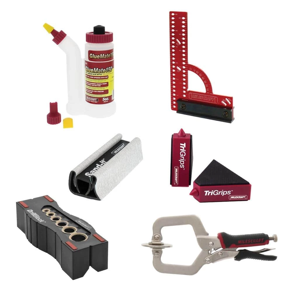 No matter the project, this kit includes just the right tool to give you the upper hand. The MC-Square150 lets you mark accurate offsets and angles with ease. Create perfectly straight, vertical holes by clamping the DrillBlock down using Milescraft FaceClamps. Add glue just where you need it using the precision GlueMate150, and sand away any imperfections with the multi-surface Sand-It.