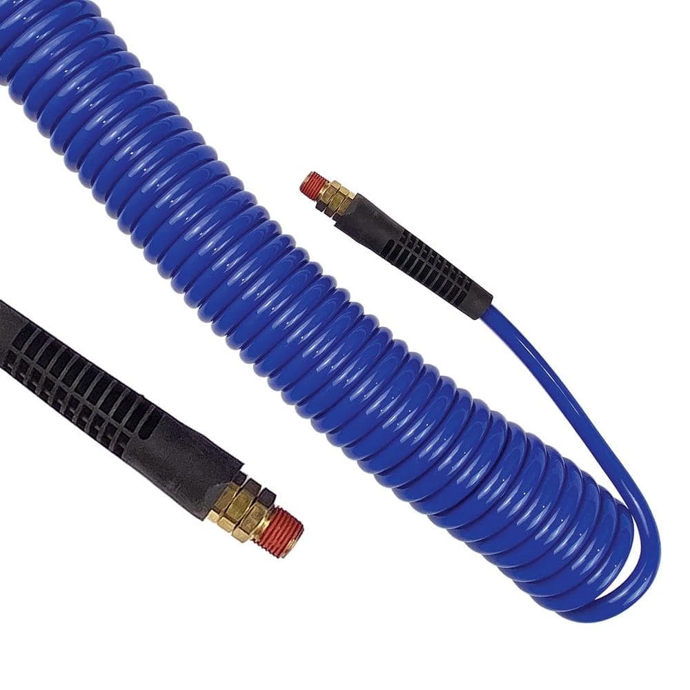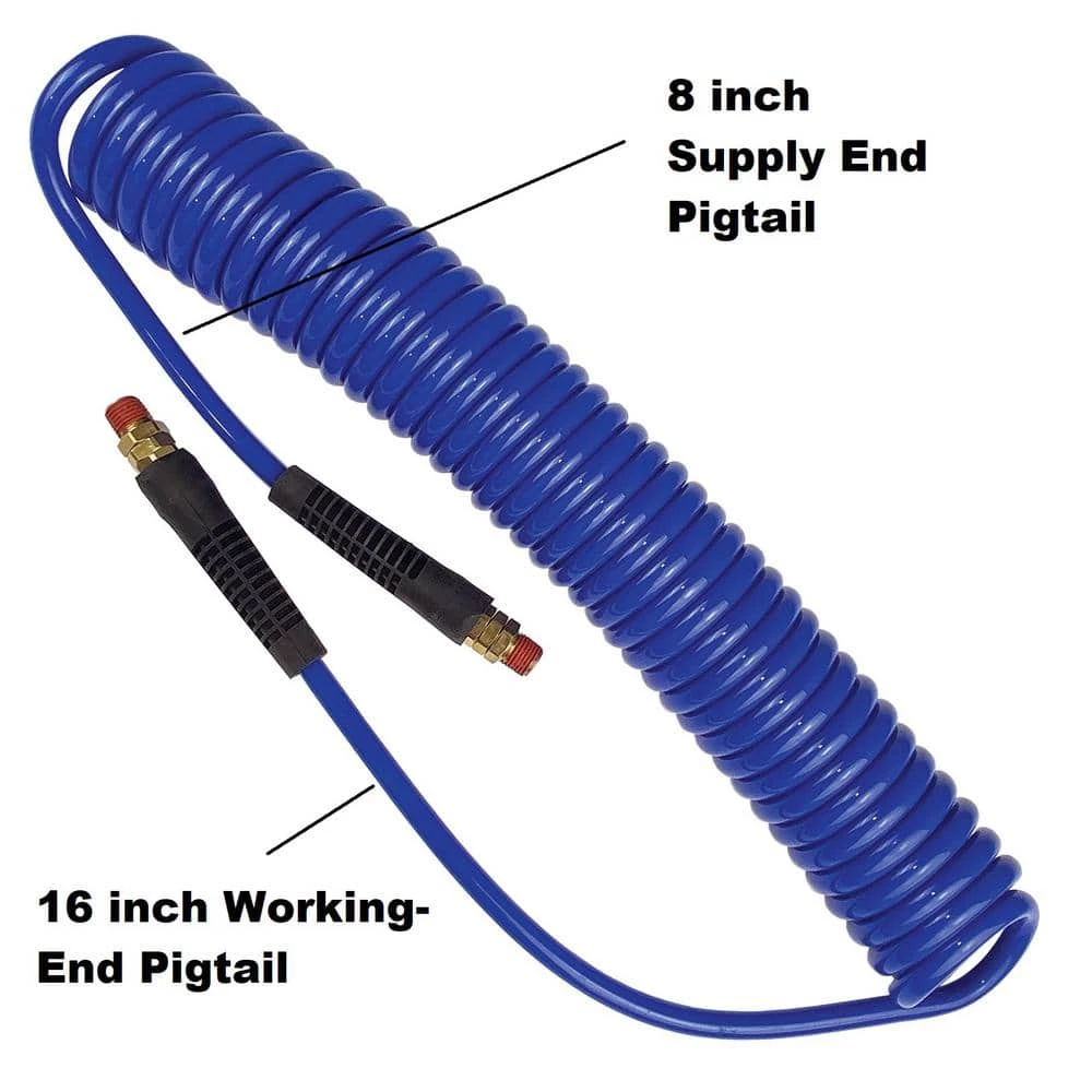 The Primefit PU14025P is a 1/4 in. x 25 ft. Polyurethane Recoil Air Hose. It features lightweight, durable and flexible polyurethane construction, with 1/4 in. brass Field Repairable Swivel Ends. IT features a 16 in. working end pigtail and an 8 in. supply side pigtail.