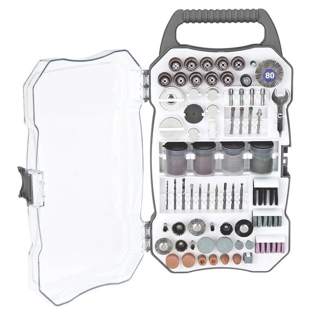 - Comprehensive kit includes cut-off disks, flap wheels, felt disks, diamond burrs and drills, wire brushes, sanding wheels, grindstones and more
