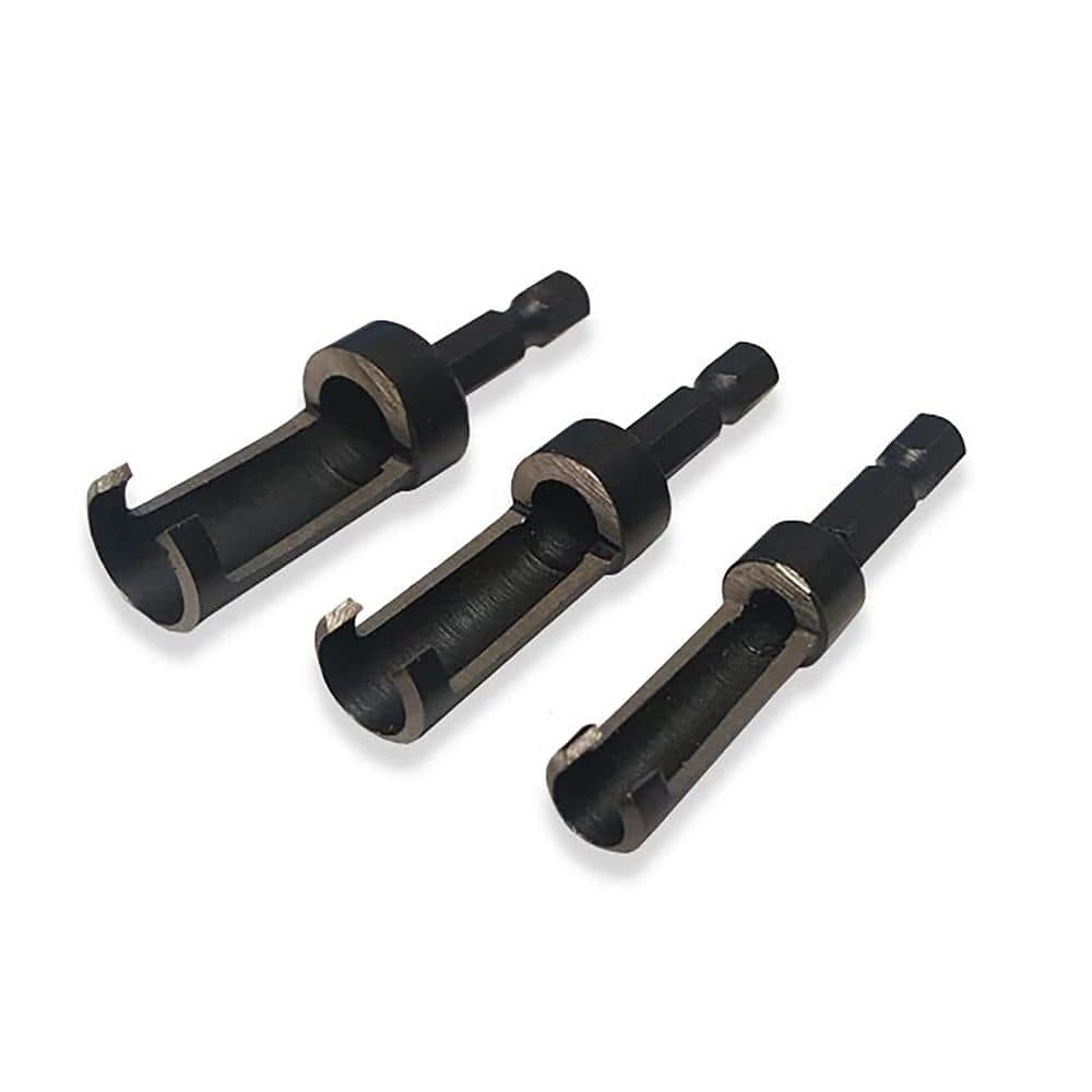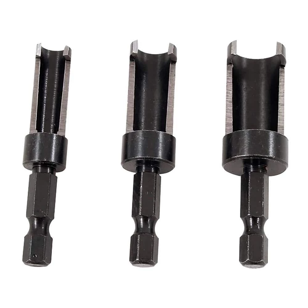 - 3-piece set includes steel plug cutters to produce 1/4 in., 3/8 in. and 1/2 in. tapered plugs for improved fit